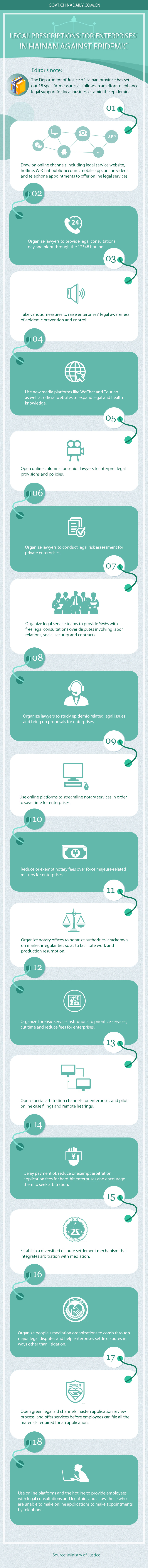 The Department of Justice of Hainan province has set out 18 specific measures in an effort to enhance legal support for local businesses amid the epidemic.