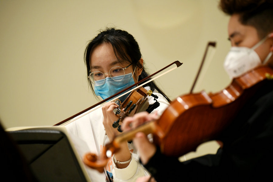 Musicians from Xi’an Symphony Orchestra rehearse for an online concert on March 27 at the Xi’an Concert Hall, Shaanxi province, March 13, 2020. [Photo/Xinhua]