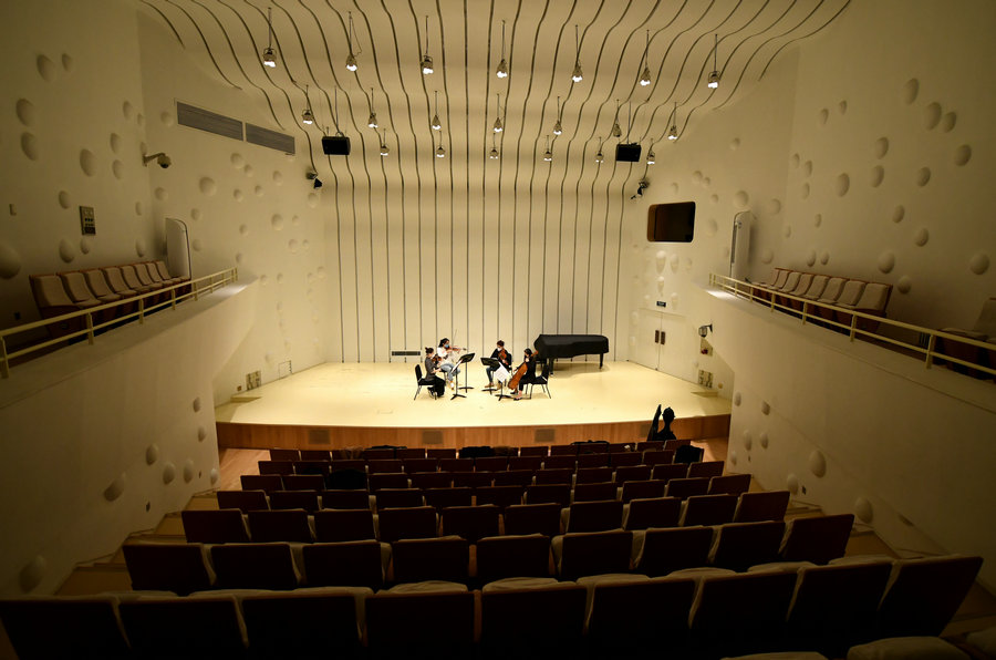 Musicians from Xi’an Symphony Orchestra rehearse for an online concert on March 27 at the Xi’an Concert Hall, Shaanxi province, March 13, 2020. [Photo/Xinhua]