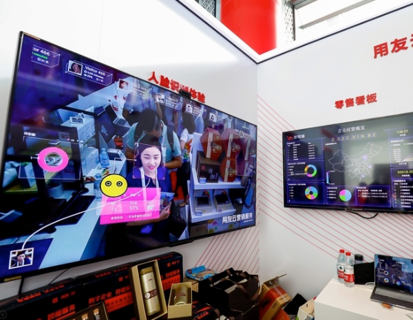 A consumer experiences Yonyou's service in a booth at a conference in Beijing, Aug 18, 2018. [Photo provided to chinadaily.com.cn ]