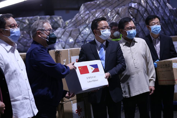 Chinese Ambassador to the Philippines Huang Xilian handed over 100,000 test kits, 10,000 personal protective equipment, 100,000 surgical masks and 10,000 N95 masks to the Philippine side to help it better fight COVID-19.