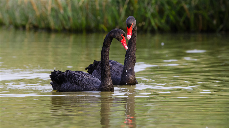 A pair of black swans swim in the Niugangshan Park of Fuzhou, capital of Southeast China's Fujian province, March 17, 2020. [Photo/Xinhua]