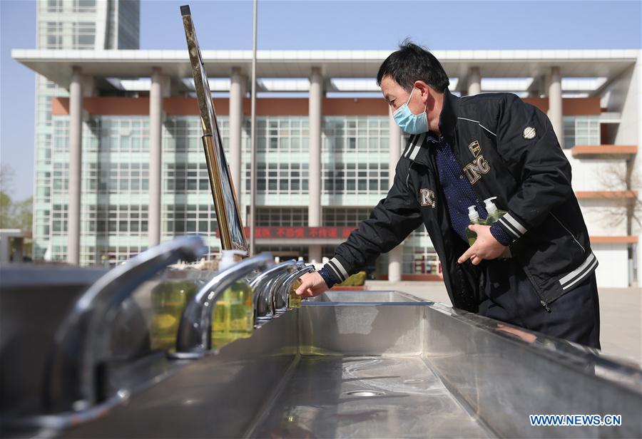 A staff member places sanitizer products in No. 2 Middle School of Yinchuan, Northwest China's Ningxia Hui autonomous region, March 21, 2020. According to local authorities, students in their final year of senior and junior high schools in Ningxia will return to school by March 25. Schools are required to prepare face masks, hand sanitizer products and other disinfectants, disinfect campus, and organize emergency exercises in a bid to ensure the orderly reopening. [Photo/Xinhua]