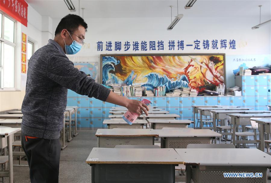 A staff member disinfects a classroom in No. 2 Middle School of Yinchuan, Northwest China's Ningxia Hui autonomous region, March 21, 2020. According to local authorities, students in their final year of senior and junior high schools in Ningxia will return to school by March 25. Schools are required to prepare face masks, hand sanitizer products and other disinfectants, disinfect campus, and organize emergency exercises in a bid to ensure the orderly reopening.[Photo/Xinhua]