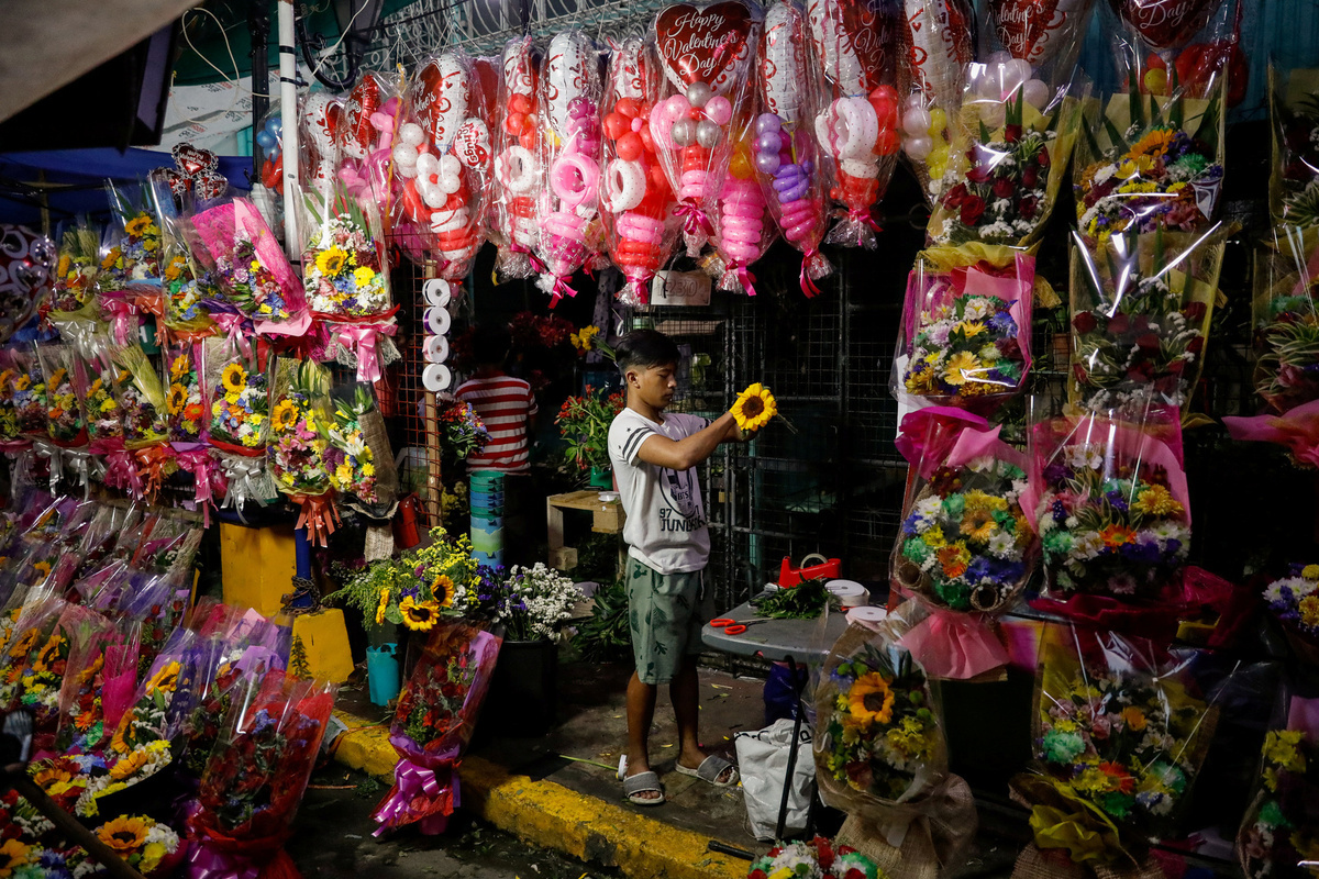 A vendor arranges a flower bouquet a day before Valentine's Day in Dangwa Flower Market in Manila, Philippines on Feb 13, 2020. [Photo/Agencies]