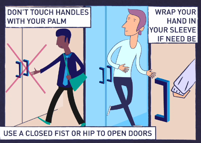 If you need to open doors, try not to grasp the handle with just your open palm. Instead use a closed fist or your hip, or at least wrap your hand in the end of your sleeve. This is especially important on bathroom and commercial doors, where germs are more easily spread.