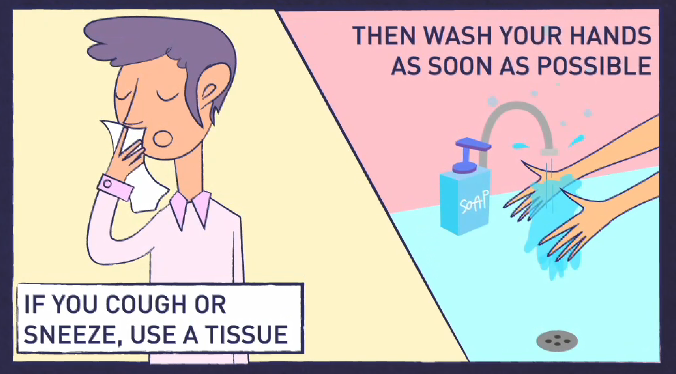 If you do not have a tissue then the next best alternative is to use your elbow, but do not cough or sneeze into your hands. The clothing you cough into could contain the virus that can be passed to others for up to a week after.
