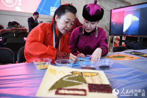 Locals try their hand at grain painting in the Inner Mongolia Museum in Hohhot, capital city of North China’s Inner Mongolia autonomous region, on Jan 2. That was the eighth day of the 12th lunar month, according to the Chinese calendar, which is recognized as the Laba Festival when they eat Laba congee, or eight treasure porridge. The dish is usually made with at least eight ingredients, representing prayers for a good harvest, happiness and peace, it is one of the most important customs of the Laba Festival. Ancestor worship is yet another custom marking the festival. [Photo/people.com.cn]