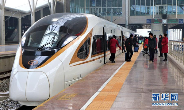 A Fuxing bullet train stops at Hohhot East Railway Station on Jan 10. The train runs on the Zhangjiakou-Hohhot High-speed line, the first railway linking Inner Mongolia autonomous region with Beijing. The high-speed line, which is one of the important sections of the Beijing-Lanzhou High-speed Railway, has a top design speed of 250 kilometers per hour. Since its official launch on Dec 30, a great deal of comfort and convenience has been offered to passengers in the Beijing-Tianjin-Hebei area. [Photo/Xinhua]