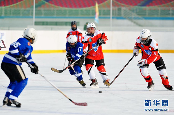 Young participants from Hohhot (dressed in red), tough it out with Mongolian teenagers during the first Hohhot International Youth Ice Hockey Invitational Tournament. It opened in Hohhot, capital city of North China’s Inner Mongolia autonomous region, on Jan 14. The tournament attracted the participation of seven teams from China’s Inner Mongolia, as well as Russia and neighbor Mongolia. [Photo/Xinhua]