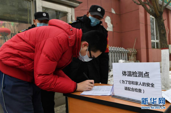 Staff members of Zhengtai Jiayuan community conduct supervision and registration of people entering and leaving the community in Hohhot, capital city of North China's Inner Mongolia autonomous region, on Jan 29. The moves were part of Hohhot's wider efforts in novel coronavirus prevention and control. As of 9 am on Feb 3, four novel coronavirus infection cases have been reported in Hohhot. [Photo/Xinhua]