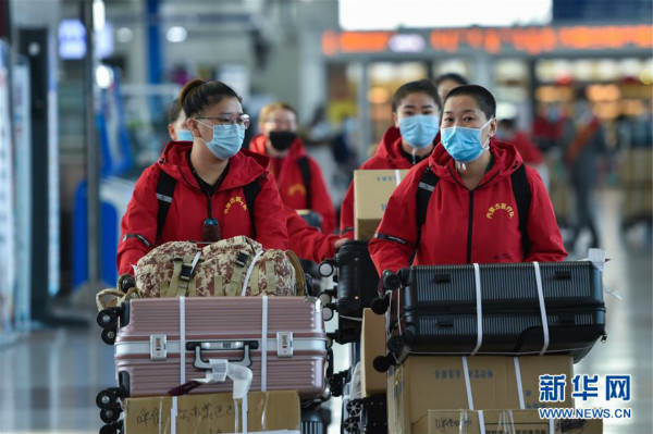 Medical staff from Inner Mongolia's seventh medical team heading for Central China's Hubei province -- to help with the novel coronavirus pneumonia prevention and control -- go to the luggage check-in counter at Hohhot Baita International Airport in Hohhot, North China's Inner Mongolia autonomous region, on Feb 18. The medical team consisted 148 medical professionals from 13 hospitals in the autonomous region, including Inner Mongolia Hospital of Traditional Chinese Medicine and Inner Mongolia No 3 Hospital. [Photo/Xinhua]
