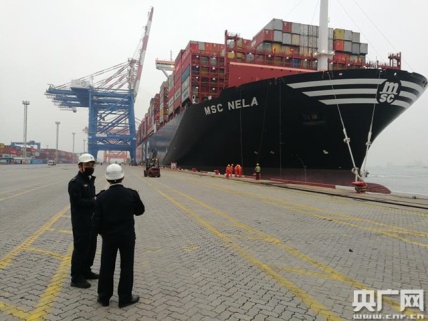 MSC NELA, one of the world's largest container ships, which has a remarkable container fleet capacity of 200,000 metric tons, docked at Xiamen Songyu Container Terminal March 31.