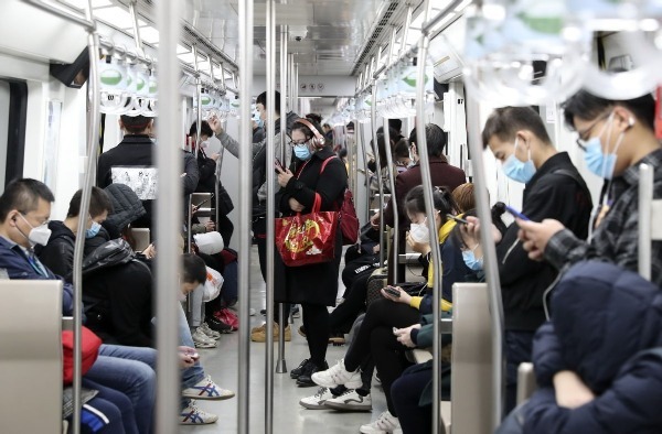 Passengers use mobile apps in a subway train in Beijing. [Photo by Feng Yongbin/China Daily]