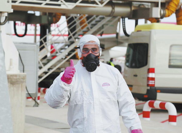 An Algerian airport employee poses for a photo while unloading medical supplies from China State Construction Engineering Corp at Houari Boumediene International Airport in Algiers, capital of Algeria, on March 27. [Photo provided to China Daily]