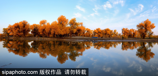 Spectacular autumn scenery of poplar forests alongside the Ejine River. [Photo/Sipa]
