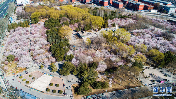 An aerial view shows Hohhot city festooned with peach blossoms as spring approaches, on April 7. [Photo/Xinhua]