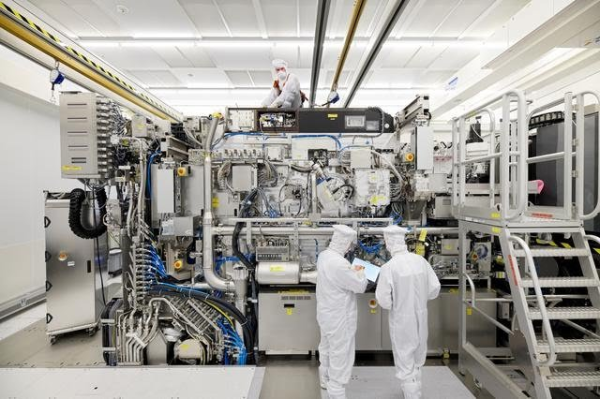 Employees work on the final assembly of a semiconductor lithography tool with its panels removed in Veldhoven, Netherlands on April 4, 2019. [Photo/Agencies]