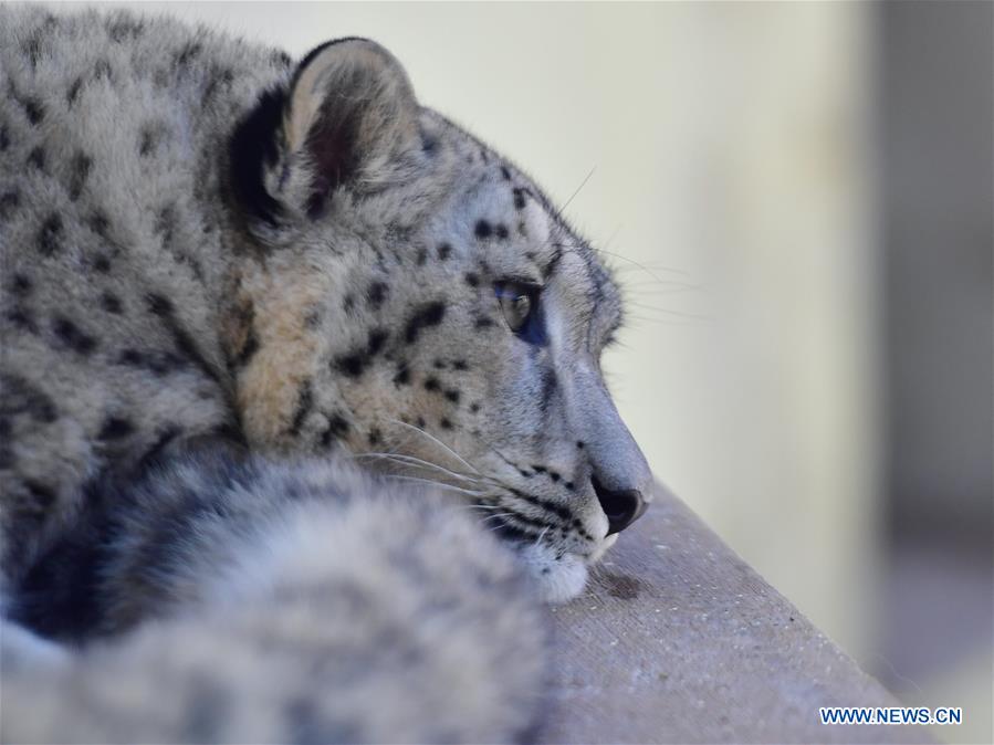 Photo taken on April 27, 2020 shows a snow leopard at the Xining Wildlife Park in Xining, Northwest China's Qinghai province. Two snow leopard cubs born at the Xining Wildlife Park in Northwest China's Qinghai province 11 months ago, made their official debut Monday. [Photo/Xinhua]