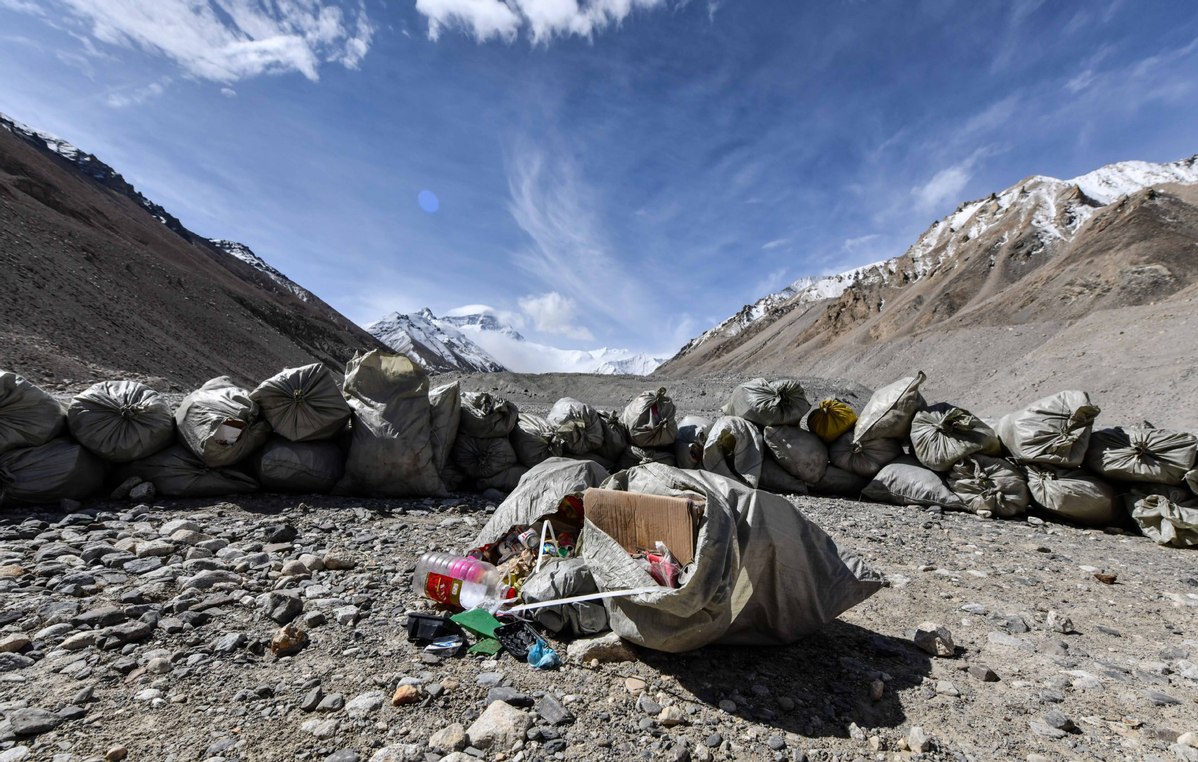 Mountaineering trash is collected on Saturday on Qomolangma, known as Mount Everest in the West, in the Tibet autonomous region as part of an annual cleaning campaign. [Photo/Xinhua]