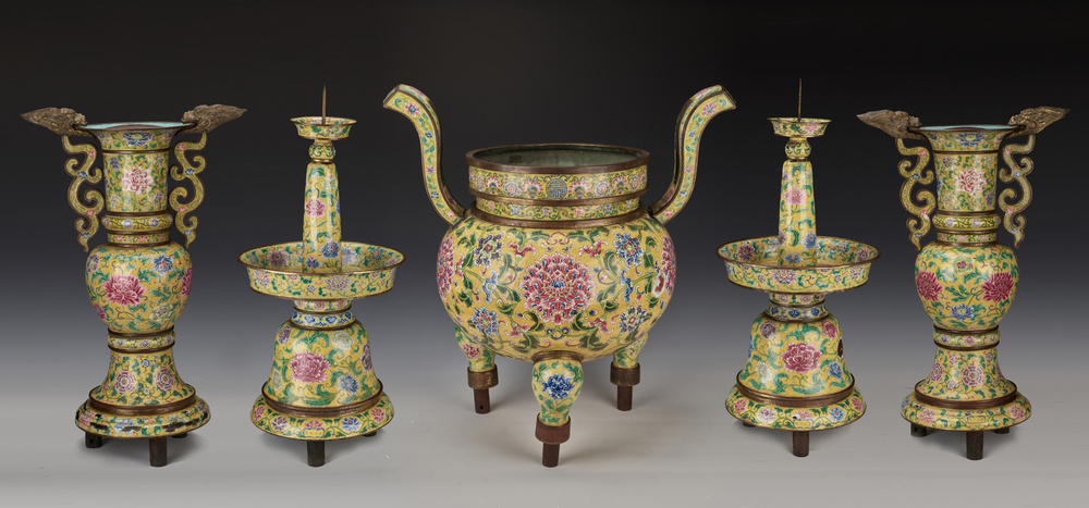 Altarpiece of an incense burner, a pair of candle sticks and a pair of vases for making offerings at the Confucius Temple. They were bestowed by Emperor Yongzheng of the Qing Dynasty in 1732. [Photo provided to chinadaily.com.cn]