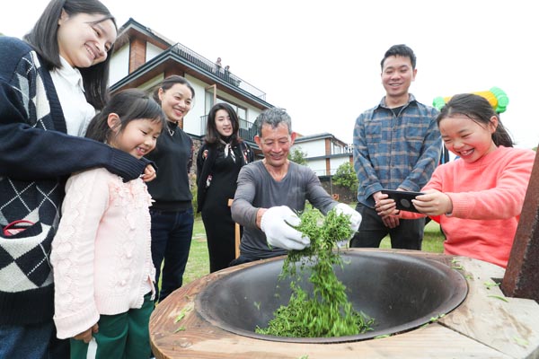 Tourists visiting a homestay in a village in Deqing, Zhejiang province, watch a farmer process tea leaves. [PHOTO BY WANG ZHENG/FOR CHINA DAILY]