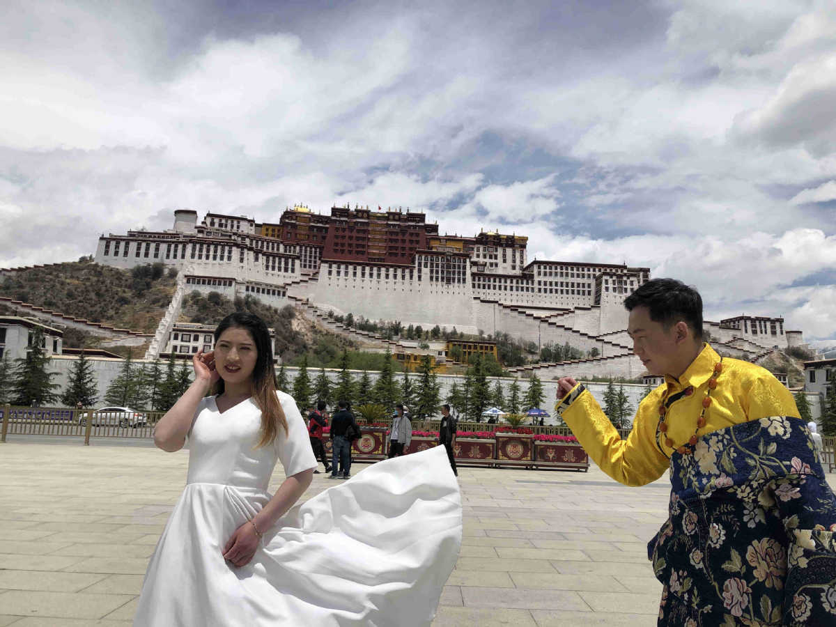 Two tourists pose for a photo in front of the Potala Palace. [Photo by Palden Nyima/chinadaily.com.cn]