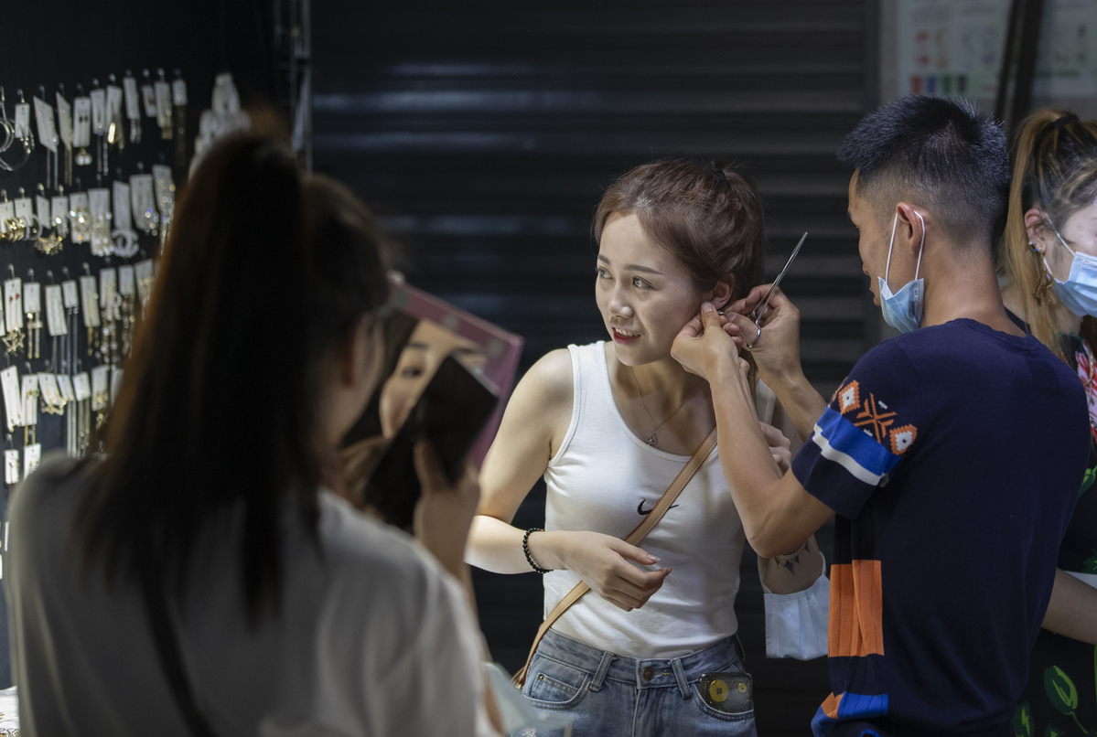 A customer tries on a pair of earrings at a night market in Baocheng Road in Wuhan, Central China's Hubei province, June 3, 2020. [Photo by Ke Hao/For chinadaily.com.cn]