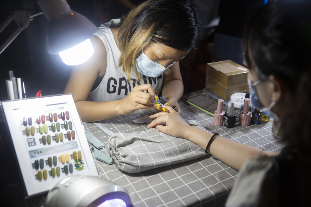 A manicurist paints nails for a customer at a night market in Baocheng Road in Wuhan, Central China's Hubei province, June 3, 2020. [Photo by Ke Hao/For chinadaily.com.cn]