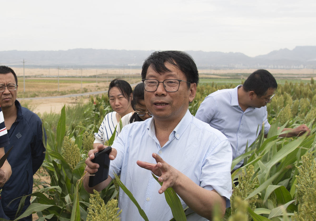 Research team leader Yi Zhijian, center, checks sorghum in a field that not long ago was desert. [Photo provided to chinadaily.com.cn]