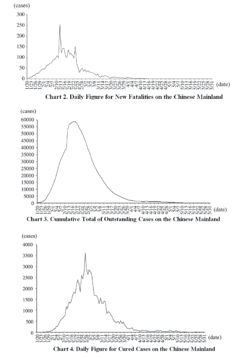 As of 24:00 of May 31, 2020, a cumulative total of 83,017 confirmed cases had been reported on the Chinese mainland, 78,307 infected had been cured and discharged from hospital, and 4,634 people had died. This demonstrates a cure rate of 94.3 percent and a fatality rate of 5.6 percent (see charts 1, 2, 3 and 4).