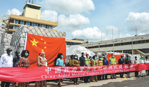 Staff of Chinese embassy in Ghana pose for a group photo with delegates of countries to receive aid at Accra Kotoka International Airport, on April 6. XU ZHENG/XINHUA