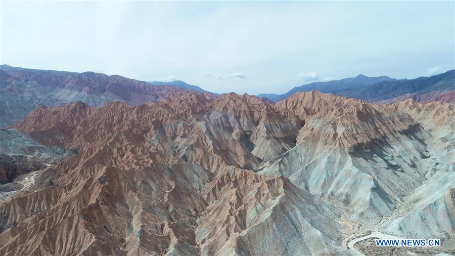 Aerial photo taken on June 5, 2020 shows a view of Danxia landform, a landscape characterized by reddish sandstone features, in Guide county, Northwest China's Qinghai province. [Photo/Xinhua]
