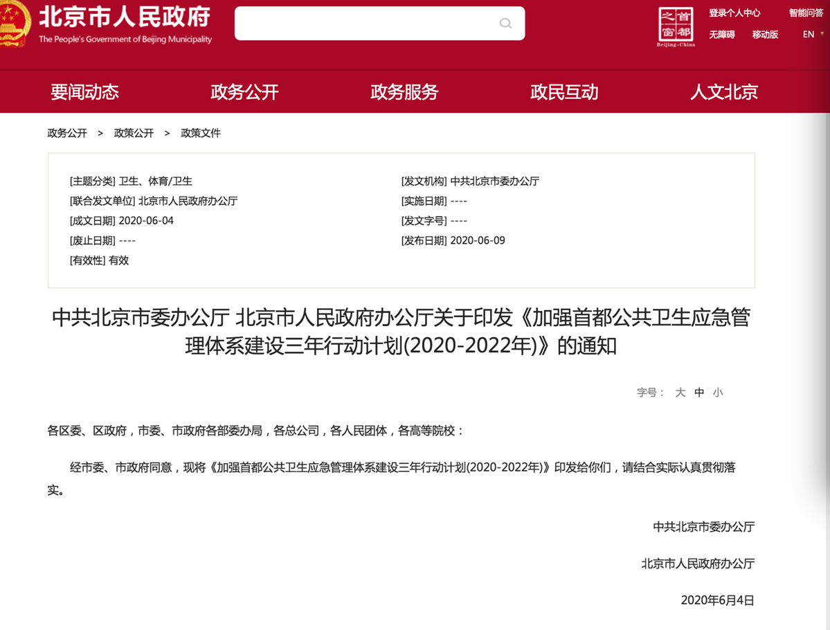 Beijing's government will keep a close eye on infectious disease prevention and control, especially major diseases and emerging infectious diseases such as the novel coronavirus, the plan said.