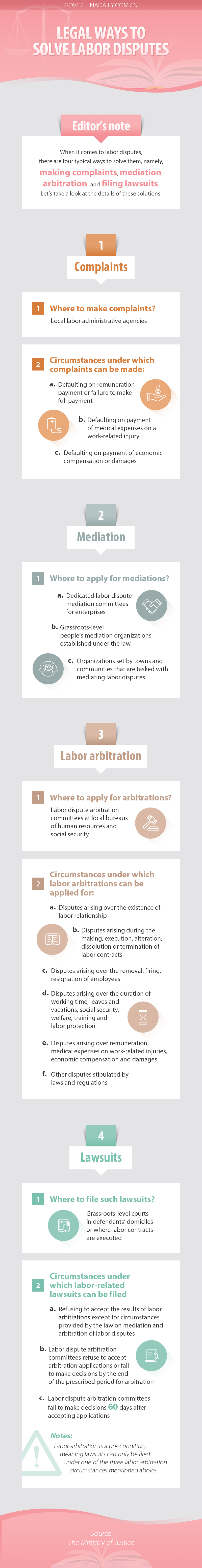 When it comes to labor disputes, there are four typical ways to solve them, namely, making complaints, mediation, arbitration and filing lawsuits.