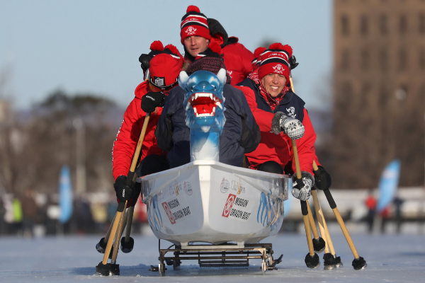 Participants compete during the Ice Dragon Boat Festival on Dows Lake in Ottawa, Feb 9, 2019. [Photo/Agencies]