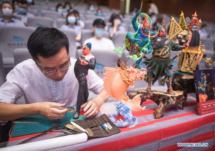 Dough modelling artist Liu Jie shows his craft during an intangible cultural heritage shopping festival at the Hubei Provincial Library in Wuhan, capital of Central China's Hubei province, June 11, 2020.[Photo/Xinhua]