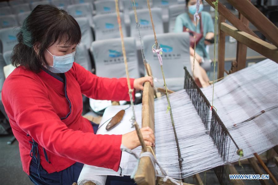 A coarse cloth craftswoman shows her skills during an intangible cultural heritage shopping festival at the Hubei Provincial Library in Wuhan, capital of Central China's Hubei province, June 11, 2020.[Photo/Xinhua]