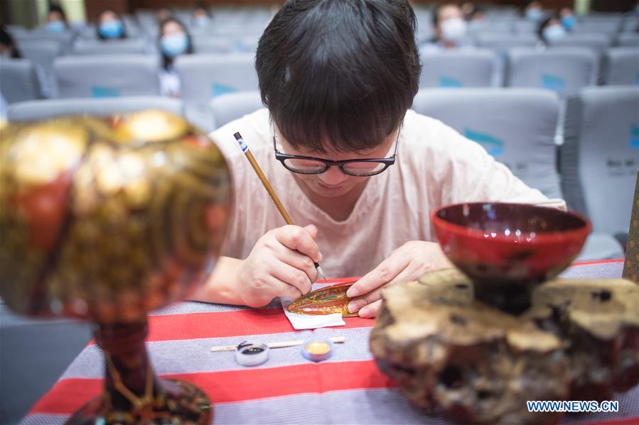 Lacquering artist Meng Xianggao makes handicraft during an intangible cultural heritage shopping festival at the Hubei Provincial Library in Wuhan, capital of Central China's Hubei Province, June 11, 2020.[Photo/Xinhua]