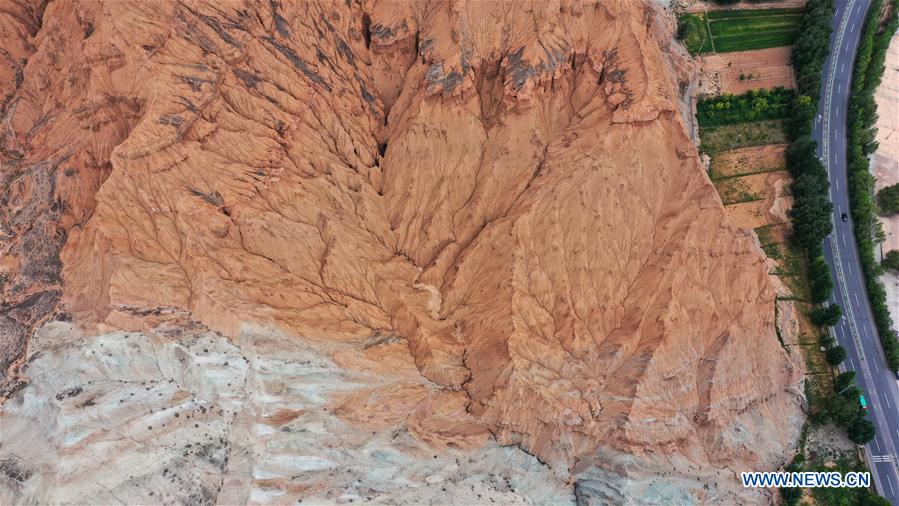 Aerial photo taken on June 15, 2020 shows a view of Danxia landform, a landscape characterized by reddish sandstone features, in Guide county, Northwest China's Qinghai province. [Photo/Xinhua]