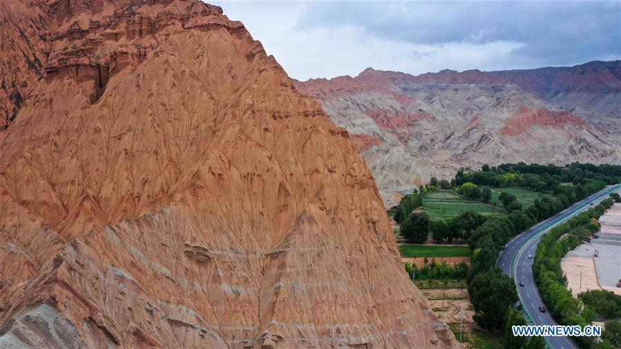 Aerial photo taken on June 15, 2020 shows a view of Danxia landform, a landscape characterized by reddish sandstone features, in Guide county, Northwest China's Qinghai province. [Photo/Xinhua]