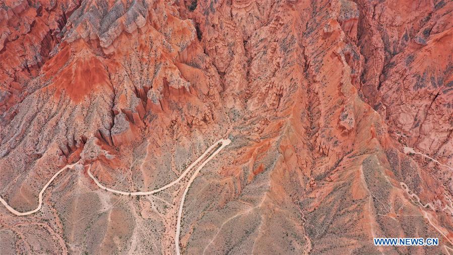 Aerial photo taken on June 15, 2020 shows a view of Danxia landform, a landscape characterized by reddish sandstone features, in Guide county, Northwest China's Qinghai province. [Photo/Xinhua]