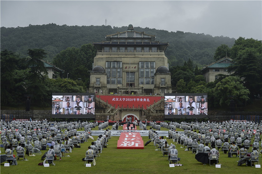 Wuhan University holds the commencement ceremony in rain on June 20, 2020. [Photo by Hu Dongdong/For chinadaily.com.cn]