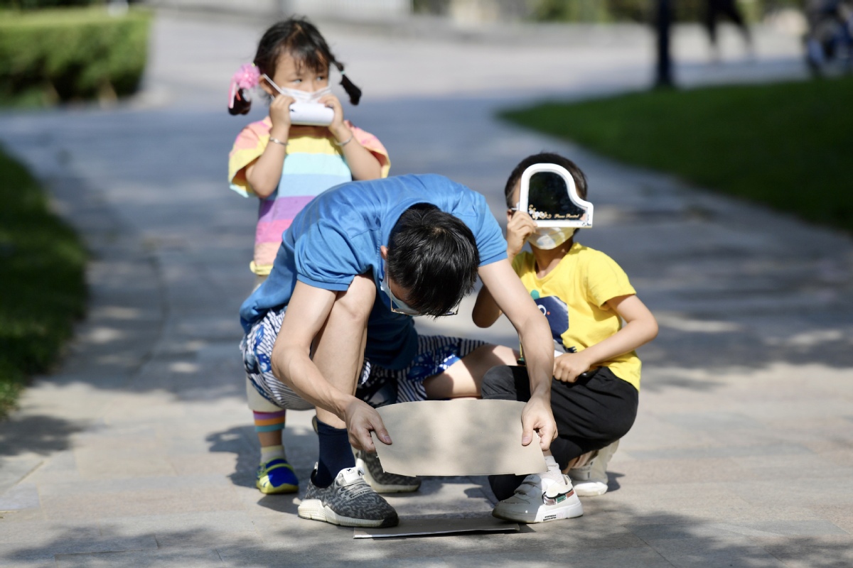 People in Beijing observe the solar eclipse using simple devices to protect their eyesight, on June 21, 2020. [Photo by Wei Xiaohao/chinadaily.com.cn]