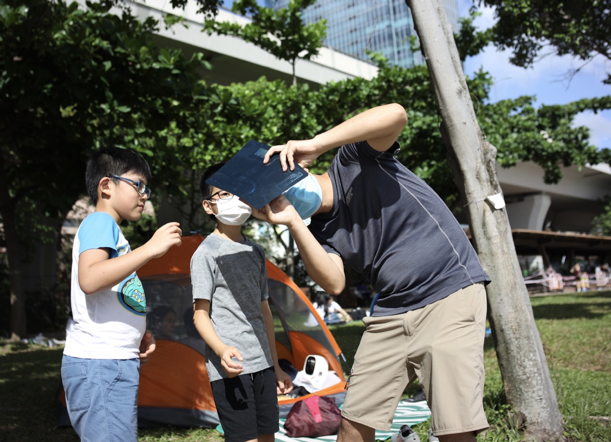 People watch the solar eclipse at a waterfront in Hong Kong's Kwun Tong Promenade on June 21. [Photo by Edmond Tang /chinadaily.com.cn]