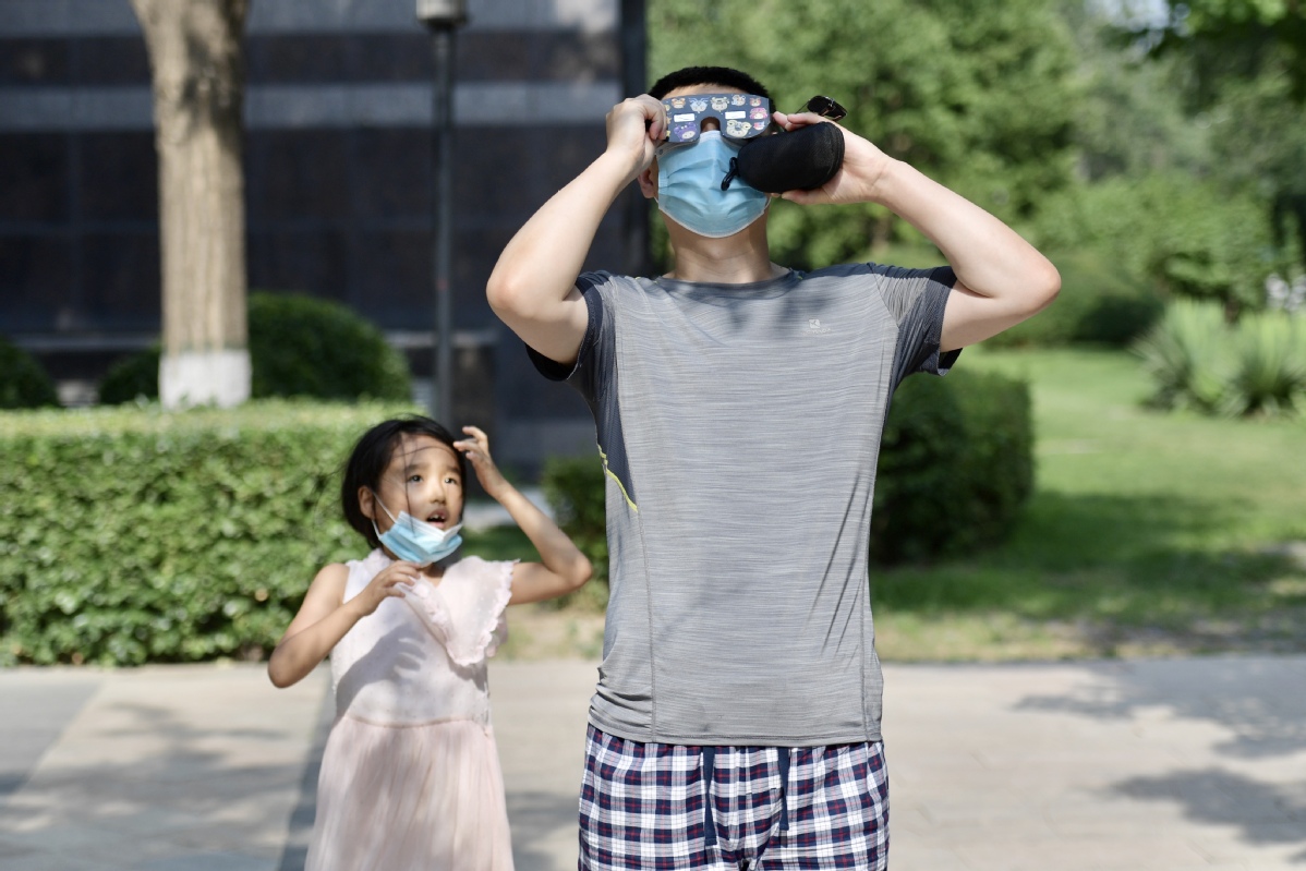 People in Beijing observe the solar eclipse using simple devices to protect their eyesight, on June 21, 2020. [Photo by Wei Xiaohao/chinadaily.com.cn]