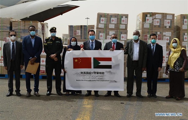 Chinese and Sudanese officials pose for a photo in front of medical supplies provided by Chinese government at Khartoum International Airport in Khartoum, Sudan, on June 18, 2020. The Chinese government on Thursday provided a new batch of medical supplies to Sudan to boost its efforts to combat the COVID-19 pandemic. [Xinhua/Ma Yichong]