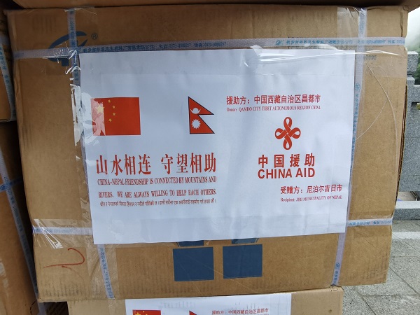 A photo of a box of medical supplies donated by Chamdo city, Tibet autonomous region to Nepal's Jiri municipality. [Photo provided to chinadaily.com.cn]