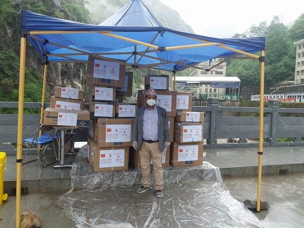 A staff worker takes a photo with the medical supplies donated by Chamdo city, Tibet autonomous region to Nepal's Jiri municipality at the Tatopani-Zhangmu border point, on June 5, 2020. [Photo provided to chinadaily.com.cn]