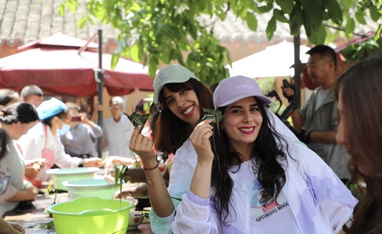 16 foreigners from 10 countries attended various celebration activities, including collecting wormwood leaves, knitting lucky rings, learning to embroider sachets, weaving flower ropes, making zongzi and frying oil cakes to experience the traditional Chinese Dragon Boat Festival in Yiqu village of Xiaojin town in Qingyang, Northwest China's Gansu province on June 24, 2020. [Photo provided to China Daily]